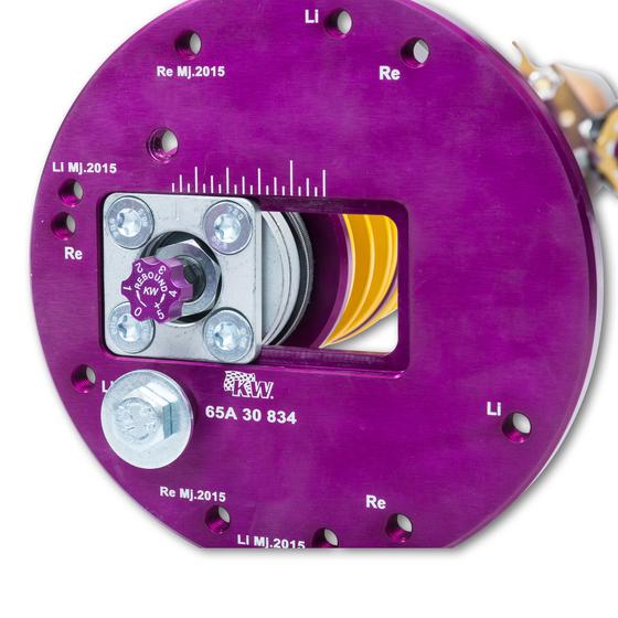 Die Verstellung erfolgt direkt am Produkt und völlig intuitiv mithilfe der markanten lilafarbenen und goldenen Einstellrädchen direkt am Ausgleichsbehälter. Dadurch passt du das Dämpfersetup ideal auf die Radlasten, das Gewicht und eine womöglich geänderte Karosseriesteifigkeit (z.B. durch verschraubte Käfige, Zellen) an.